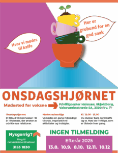I Onsdagshjørnet kan du møde andre mennesker, få inspiration til aktiviteter og indsigter, have en hyggelig kaffe-snak med de andre og måske finde nye kontakter og relationer.